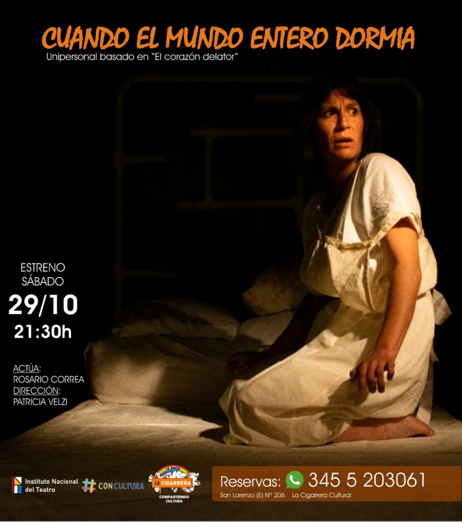 El sábado 29 de octubre a las 21:30 en “La Cigarrera” (San Lorenzo este 206) se estrena “Cuando el mundo entero dormía” un unipersonal interpretado por Rosario Correa, bajo la dirección de Patricia Velzi, basado en el cuento “El corazón delator” de Edgar Allan Poe. La obra cuenta con música original de Diego Perichón y Guillermo Russo, el diseño de vestuario y escenografía de la artista plástica Julia Ruedas.