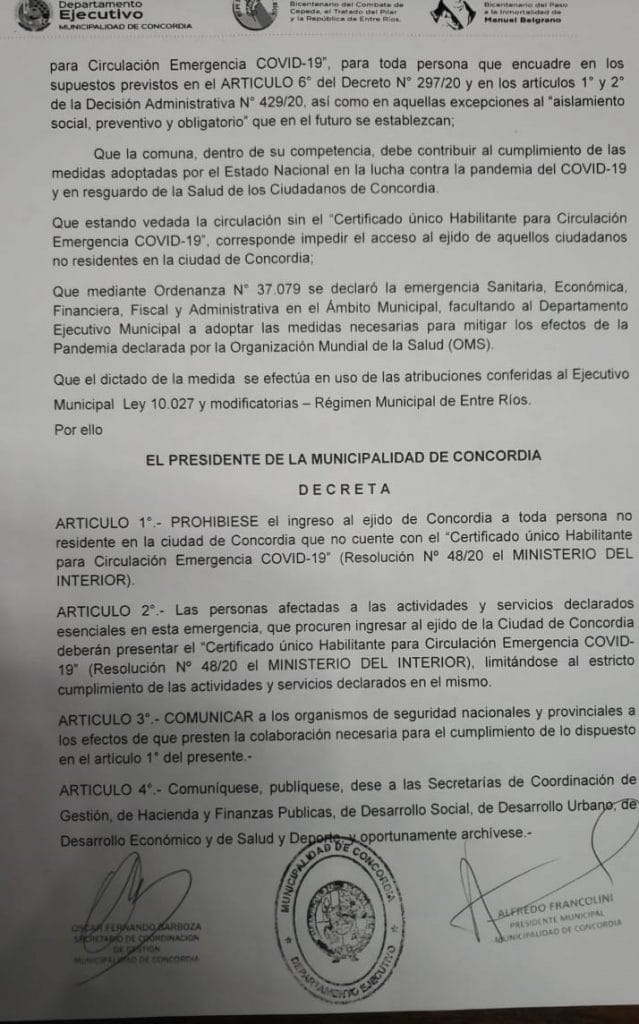 En el marco de una serie de medidas dispuestas por el Presidente Municipal en el día de ayer, se prohíbe “el ingreso al ejido de Concordia a toda persona no residente en la ciudad que no cuente con el Certificado Único Habilitante para Circulación Emergencia COVID-19”.