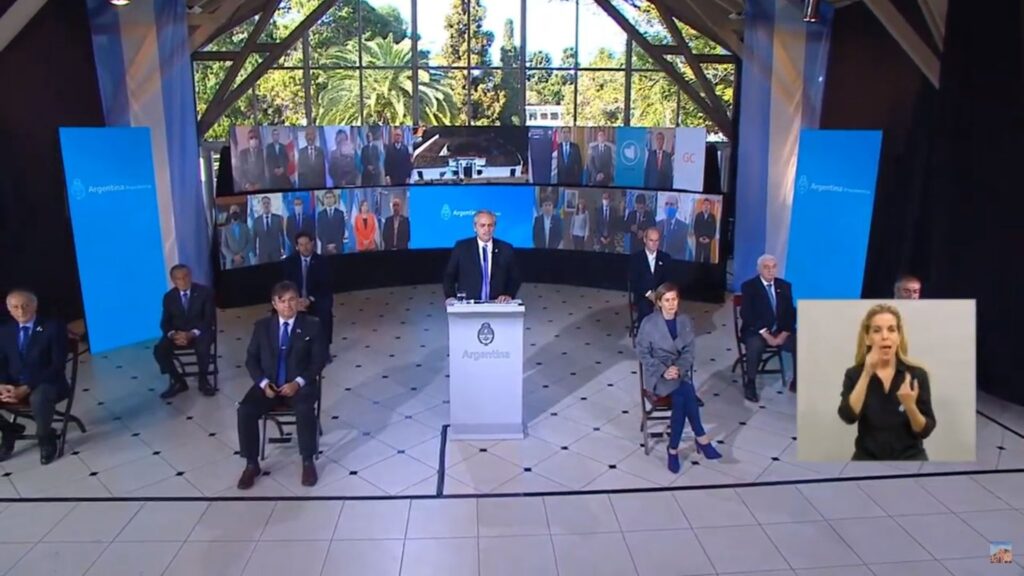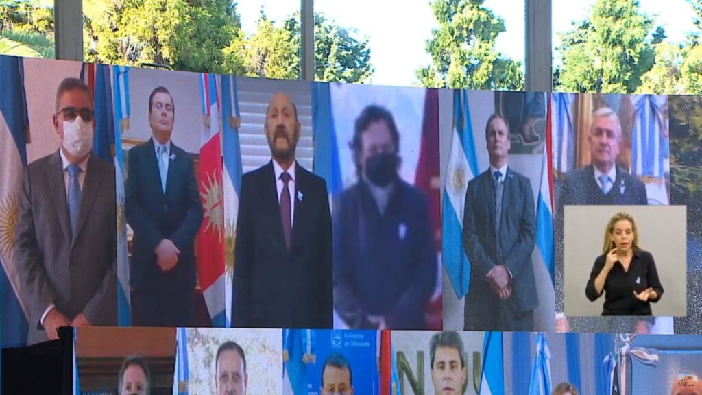 Luego hizo lo propio, mediante videoconferencia con el presidente de la Nación, Alberto Fernández, y 24 gobernadores, donde de manera virtual conmemoraron los 204 años de la independencia argentina, también en conexión con la casa histórica de Tucumán