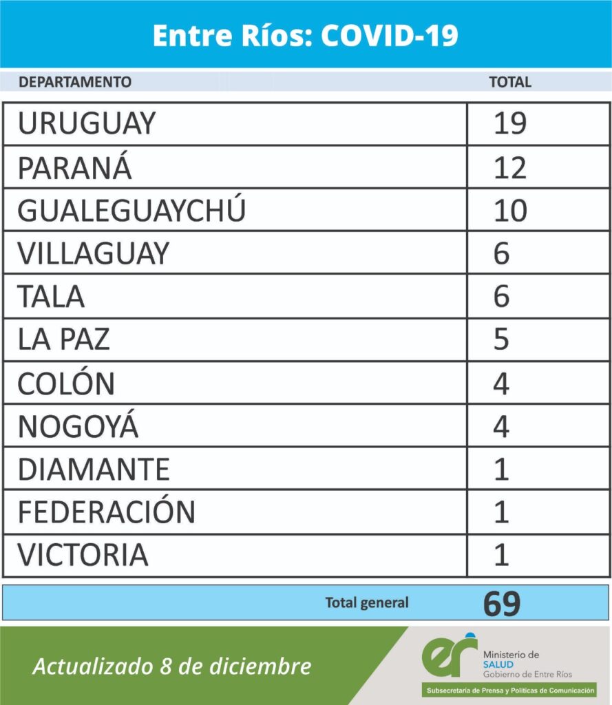 El área de Vigilancia Epidemiológica del Ministerio de Salud, confirmó que en Entre Ríos este martes se registraron 69 nuevos casos de coronavirus.