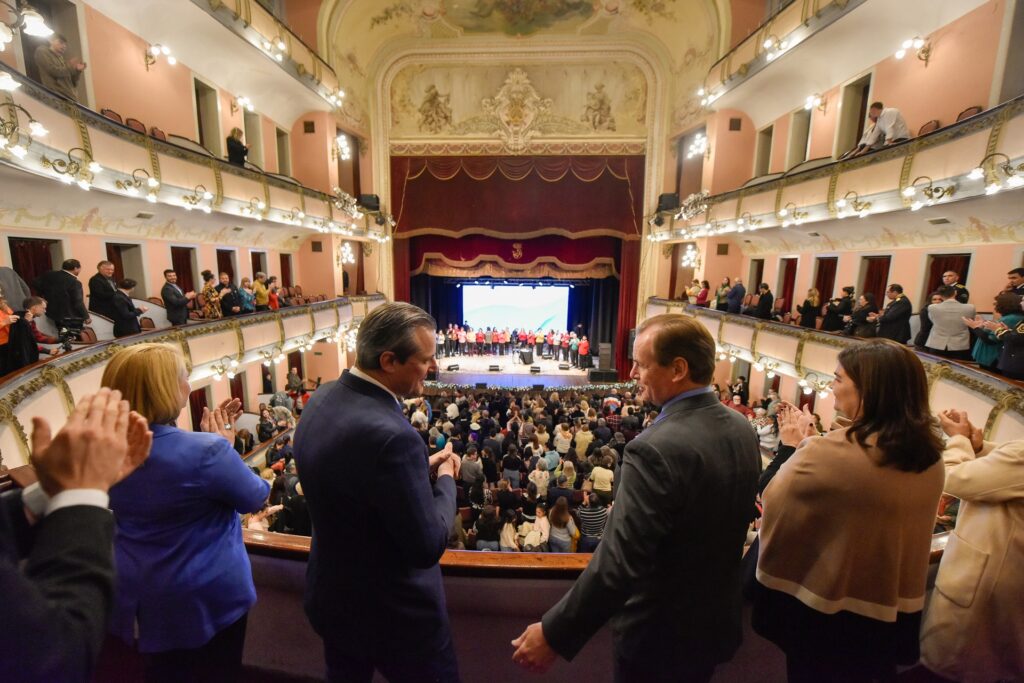 Acompañado por el intendente de Paraná, Adán Bahl, y la presidenta de la Fundación Iapser, Mariel Ávila, el mandatario entrerriano participó de la función de gala que ofreció la Municipalidad de Paraná en el Teatro 3 de Febrero. Actuaron la cantautora Teresa Parodi, con músicos y músicas de la provincia y el Coro de la Ciudad.