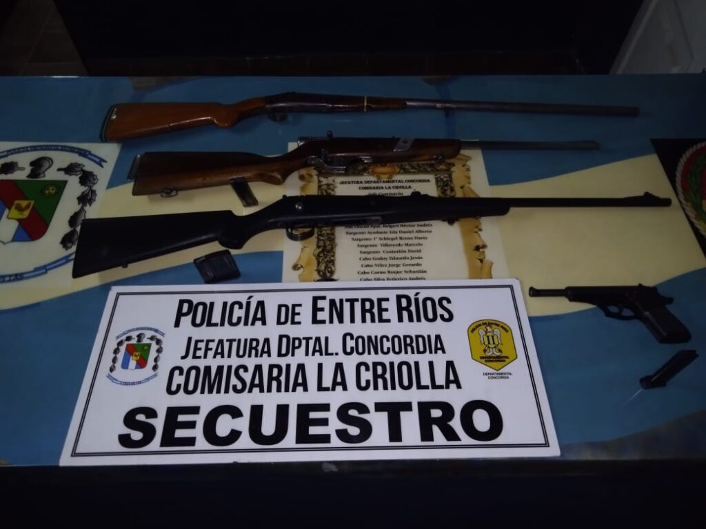 En el lugar se procedió a Notificar de la Medida a dos personas mayores de edad, asimismo se procedió al secuestro de: una Pistola calibre 22, dos Carabinas, una Escopeta calibre 16 y documentación respectiva a las armas.
