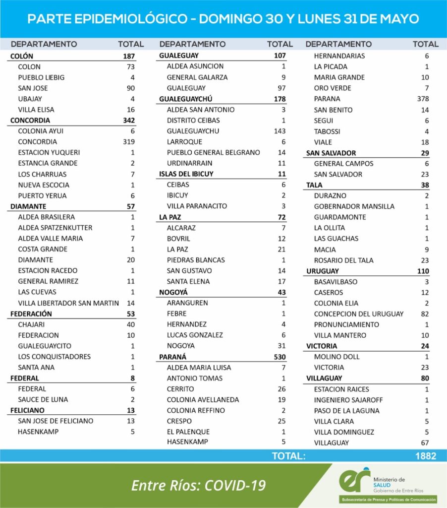 En virtud de los datos reportados por el área de Vigilancia Epidemiológica del Ministerio de Salud, en Entre Ríos se han sumado 1.882 casos de Coronavirus. Los mismos corresponden a la suma de dos días: 1145 del domingo y 737 del lunes 31 de mayo.