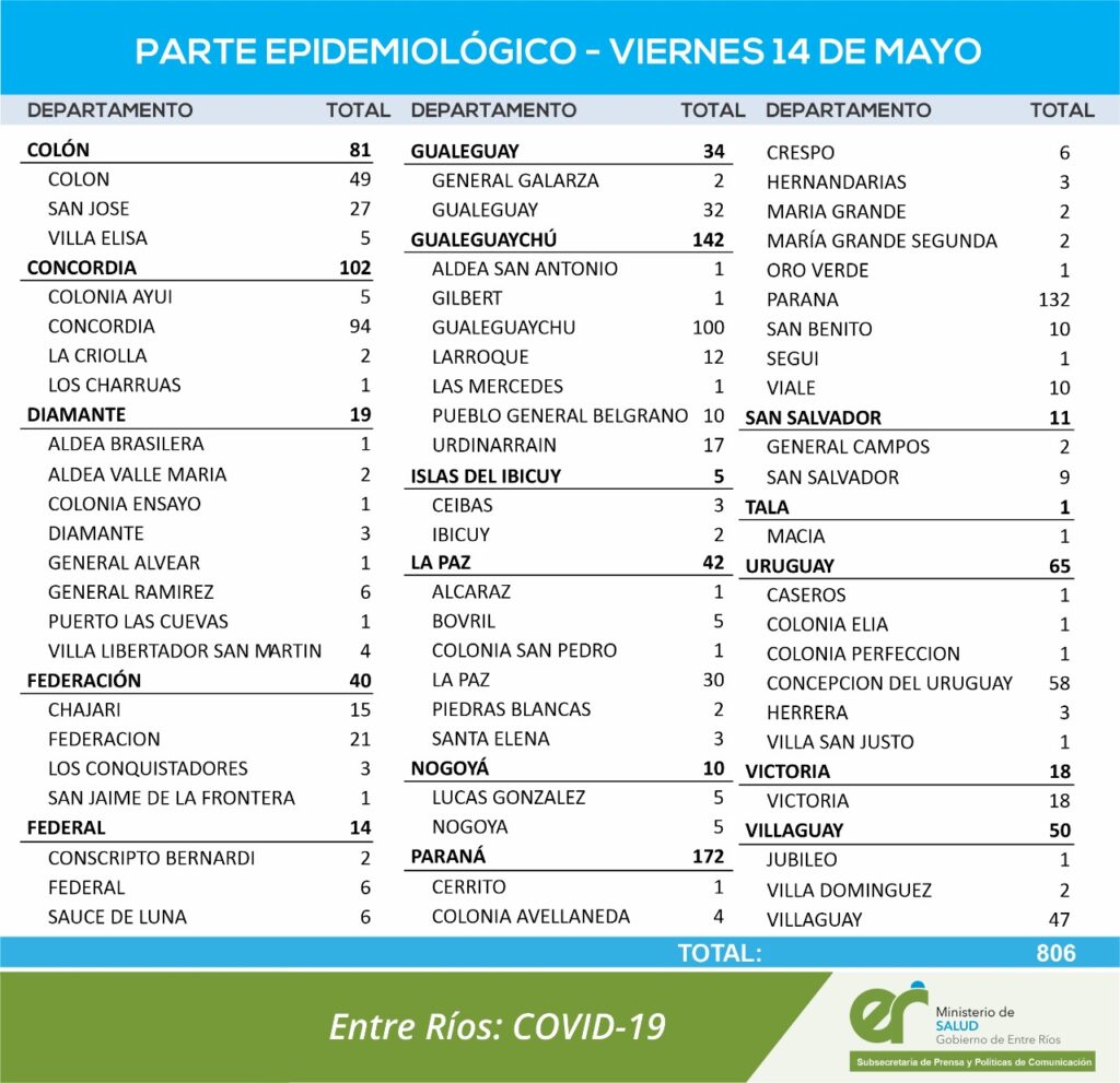 En virtud de los datos reportados este viernes 14 de mayo por el área de Vigilancia Epidemiológica del Ministerio de Salud, en Entre Ríos se han sumado 806 casos de Coronavirus.