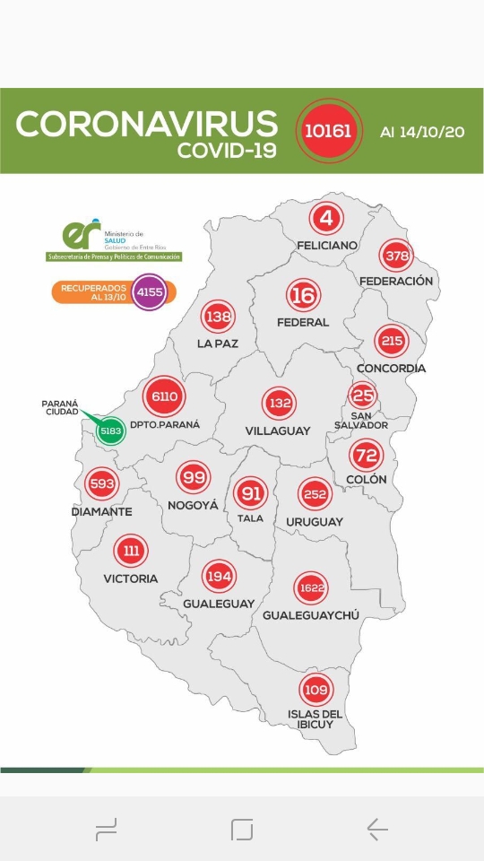A partir de los datos reportados al 14 de Octubre de 2020 por el área de Vigilancia Epidemiológica del Ministerio de Salud, en Entre Ríos se han sumado 316 casos de Coronavirus.