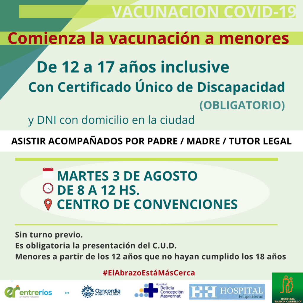 De acuerdo a lo establecido en el Plan Rector de Vacunación, este martes se aplicarán dosis a personas a partir de los 12 años y hasta los 17 inclusive (que no hayan cumplido los 18), y que presenten el Certificado Único de Discapacidad, requisito indispensable, y DNI con domicilio en la ciudad.