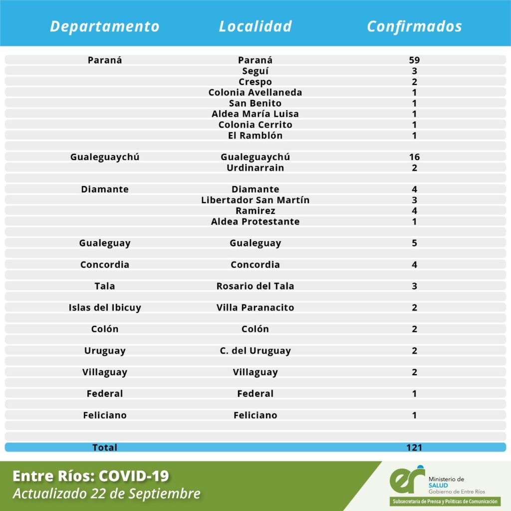 A partir de los datos reportados al 22 de Septiembre de 2020 por el área de Vigilancia Epidemiológica del Ministerio de Salud, en Entre Ríos se han sumado 121 casos de Coronavirus que se distribuyen departamentalmente de la siguiente manera: