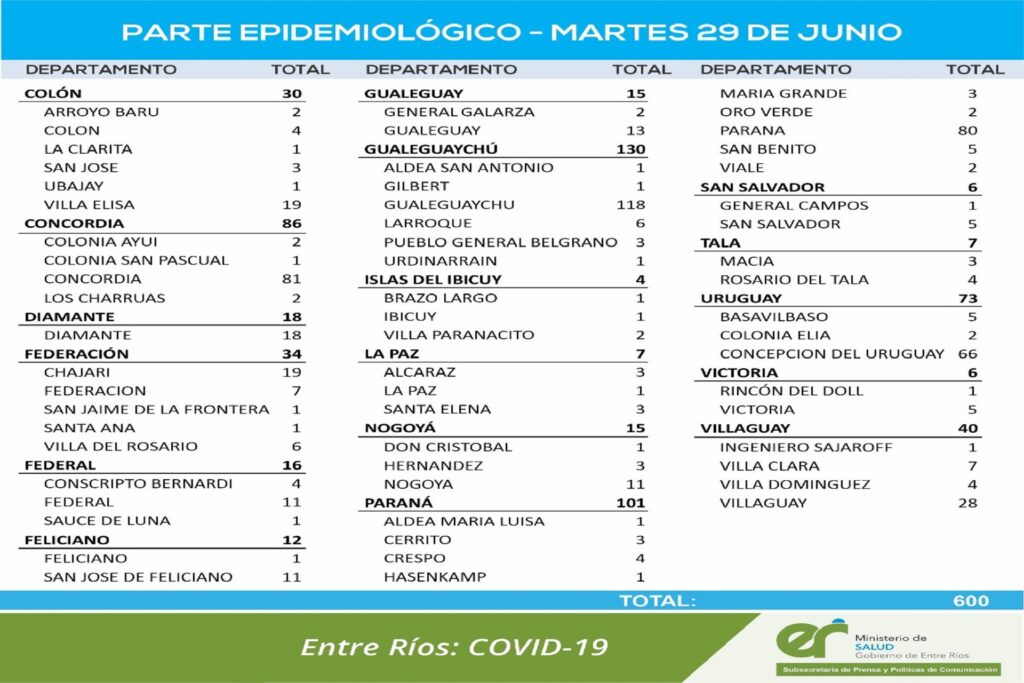 El área de Vigilancias Epidemiológica del Ministerio de Salud, confirmó que en Entre Ríos este martes se registraron 600 nuevos casos de coronavirus.