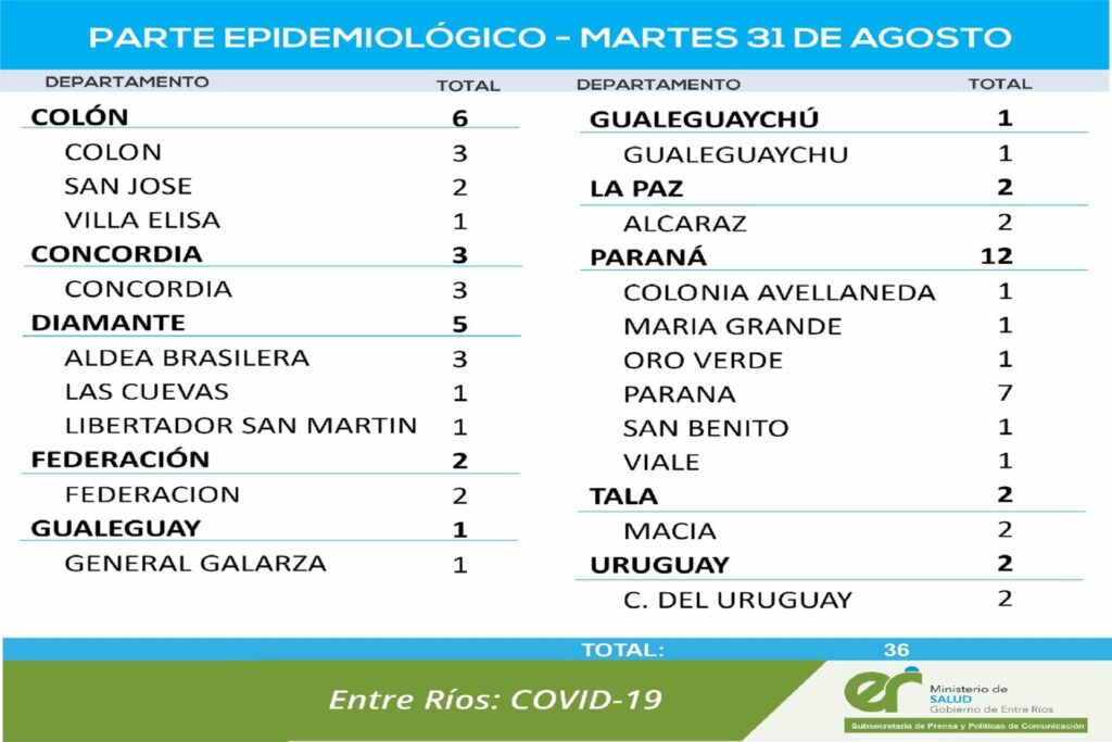 El área de Vigilancias Epidemiológica del Ministerio de Salud confirmó que en Entre Ríos este martes se registraron 36 nuevos casos de coronavirus.