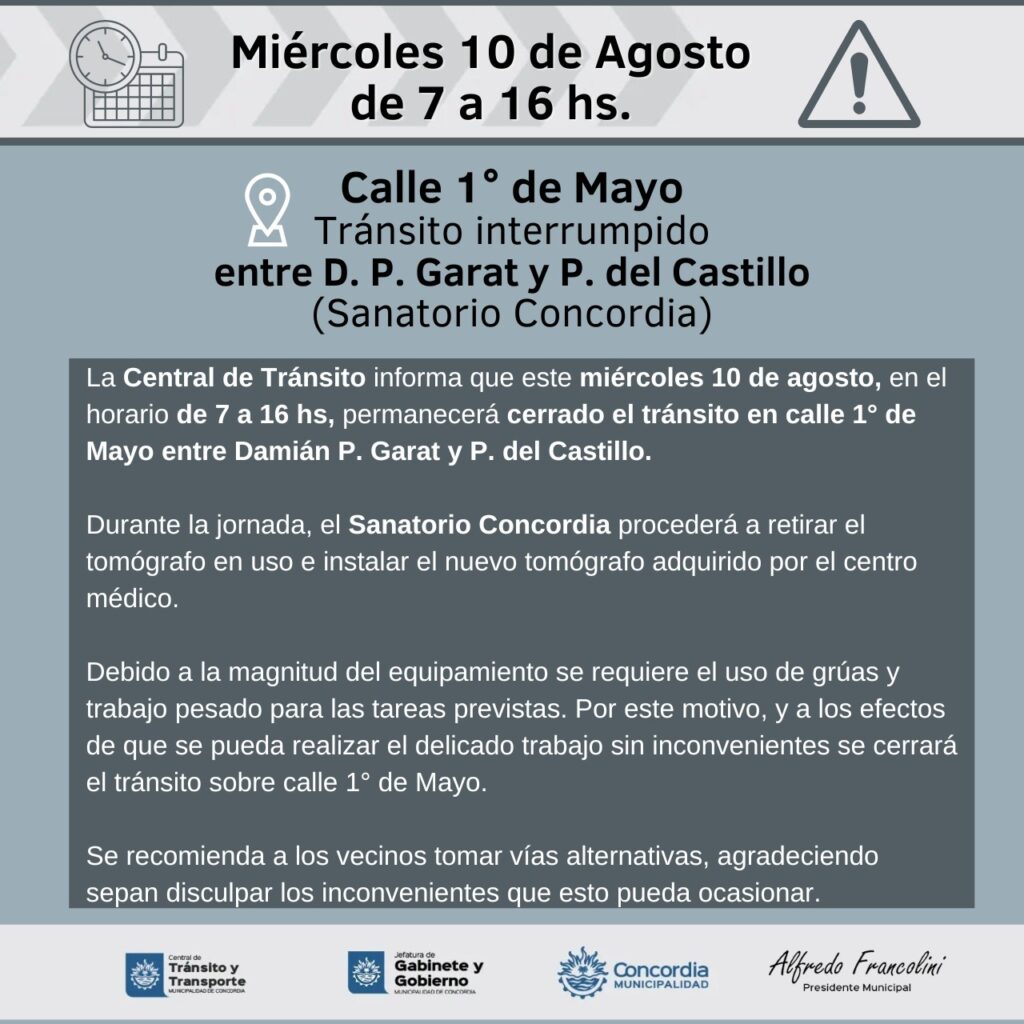 La Central de Tránsito informa que este miércoles 10 de agosto, en el horario de 7 a 16 hs, permanecerá cerrado el tránsito en calle 1° de Mayo entre Damián P. Garat y P. del Castillo.