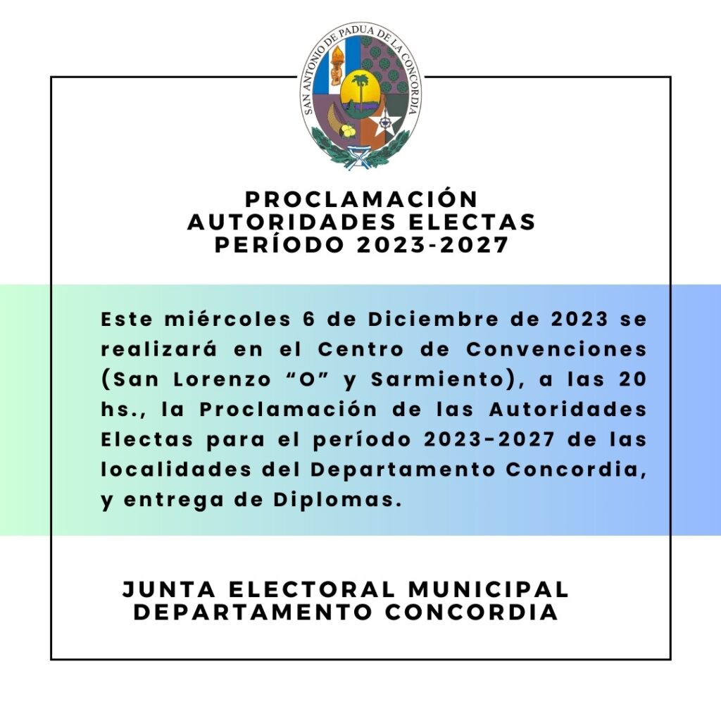 Este miércoles 6 de diciembre a las 20 hs en el Centro de Convenciones, la Junta Electoral Municipal del Departamento Concordia realizará la proclamación de las autoridades electas y entrega de Diplomas a los Vocales de Juntas de Gobierno, Concejales, Viceintendentes e Intendentes electos del Departamento Concordia para el período 2023-2027.