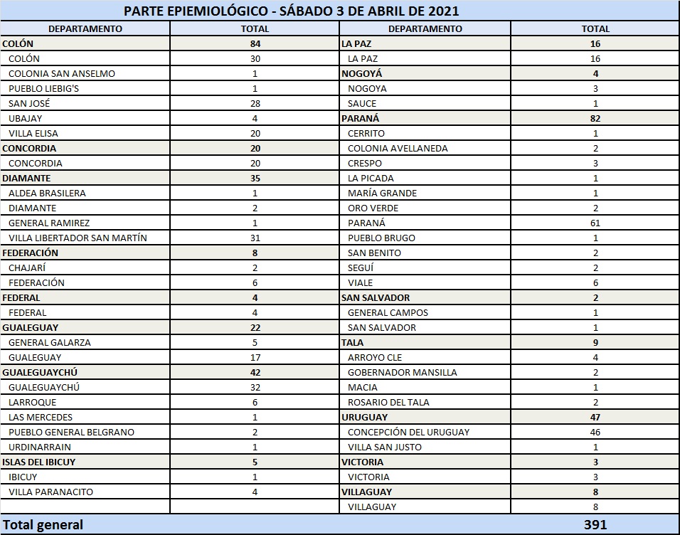En virtud de los datos reportados al 3 de abril de 2021 por el área de Vigilancia Epidemiológica del Ministerio de Salud, en Entre Ríos se han sumado 391 casos de Coronavirus, los mismos corresponden a las últimas 48 horas.