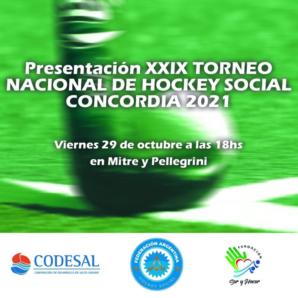 La Corporación de Desarrollo de Salto Grande (CODESAL) junto a la Federación Argentina de Hockey Social y la Fundación Ser y Hacer, invitan a participar de la Presentación oficial del “XXIX Torneo Nacional de Hockey Social Concordia 2021”, que se realizará el próximo viernes 29 de octubre a las 18 hs, en Centro de Información Turística (CIT), ubicada en Mitre y Pellegrini.