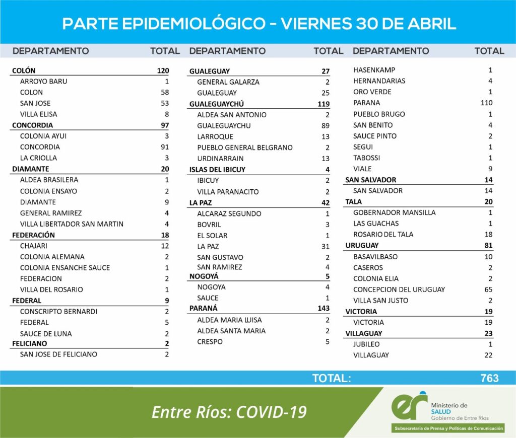 El área de Vigilancia Epidemiológica del Ministerio de Salud, confirmó que en Entre Ríos este viernes se registraron 763 nuevos casos de coronavirus.