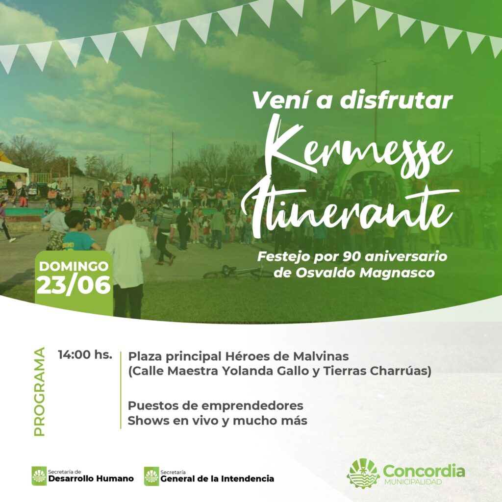 Este domingo 23 de junio se llevarán a cabo los festejos por el 90 aniversario de Osvaldo Magnasco, con una serie de actividades programadas por la Municipalidad de Concordia a través de las Secretarías de Desarrollo Humano y General de la Intendencia.