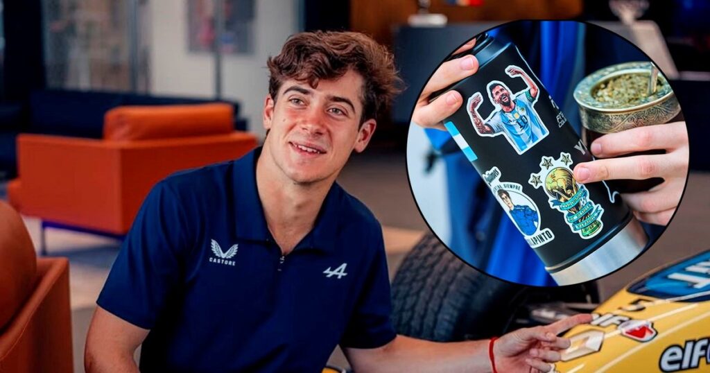 El termo de Franco Colapinto, con stickers de Lionel Messi y la Selección Argentina. (@kymillman)Meses más tarde, tras el Gran Premio de Las Vegas, volvieron a preguntarle por el 10 y reconoció: “Yo tuve algo parecido a Leo. El esfuerzo es parecido y las ganas de llegar a lo máximo de nuestro deporte fueron las mismas. Mis ganas ahora son obviamente conseguir todo lo que consiguió él en su deporte”.