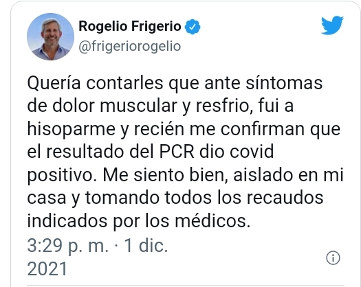 “Quería contarles que ante síntomas de dolor muscular y resfrío, fui a hisoparme y recién me confirman que el resultado del PCR dio covid positivo”, resaltó Frigerio. Y agregó: “Me siento bien, aislado en mi casa y tomando todos los recaudos indicados por los médicos”.