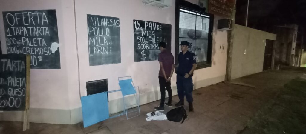 En el día ayer a las 20 hs. personal policial de Comisaría Tercera, intervino en un hecho delictivo en Calle 3 de Febrero Nº 336 donde funciona una pizzería, en el lugar un masculino había sustraído una mesa y una silla metálica. Seguidamente se inicia una búsqueda en la zona y se encuentra al autor del hecho en Calle P. del Castillo y San Lorenzo, el cual, se movilizaba con los elementos antes descriptos. En razón de los hechos se procedió a la aprehensión en flagrancia de un masculino de nombre Exequiel de 23 años de edad. Informado al Fiscal en Turno, quien dispuso la Detención del mismo y que sea alojado en la Sección Alcaldía Policial.