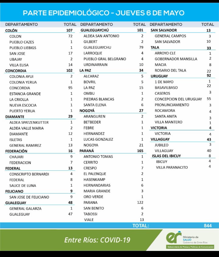 En virtud de los datos reportados este jueves 6 de mayo por el área de Vigilancia Epidemiológica del Ministerio de Salud, en Entre Ríos se han sumado 844 casos de Coronavirus