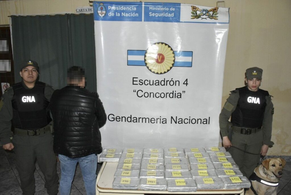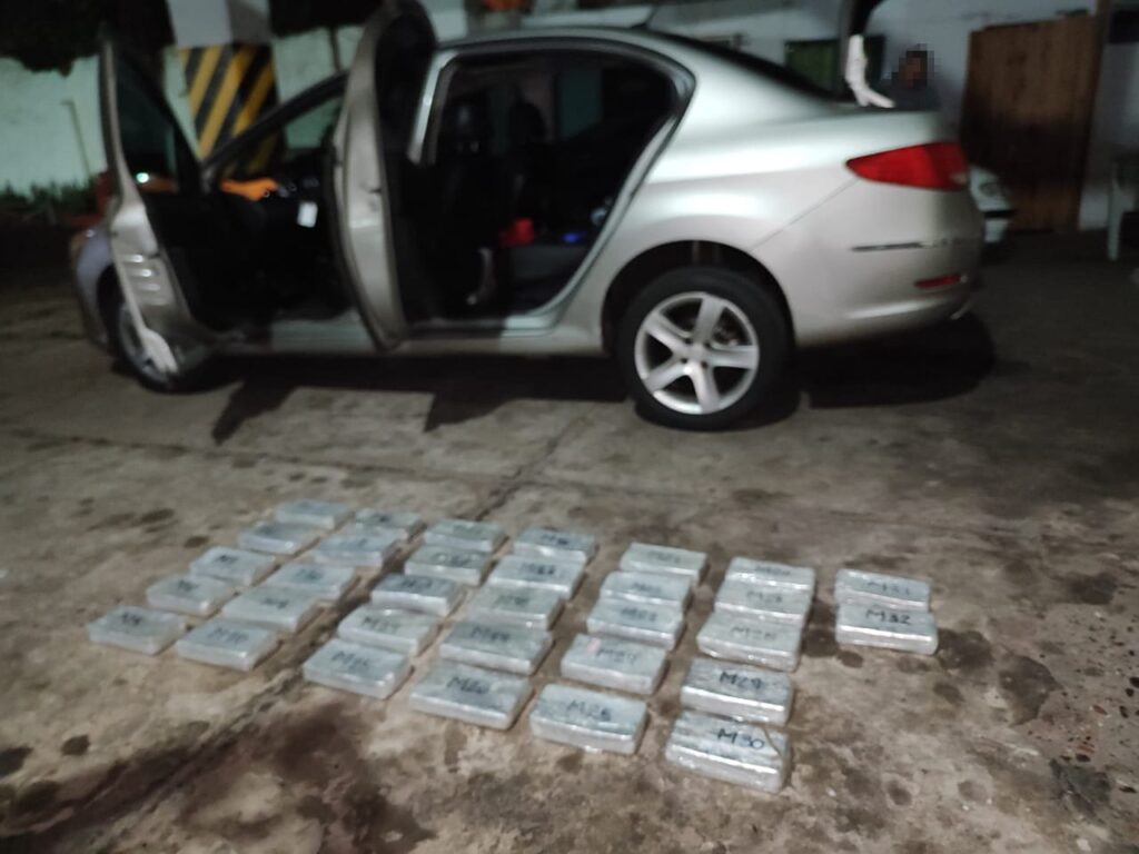 Al momento de la inspección, el can antinarcóticos “Zeus” marcó la presencia de droga. Del contacto con el Juzgado Federal de Concordia a cargo del Dr. Pablo Andrés Seró y la Fiscalía Federal de Formosa a cargo del Dr. Luis Roberto Benítez, autorizaron el traslado del vehículo y el conductor hasta el Paso Internacional Salto Grande, donde fue sometido al escáner de la AFIP-DGA, detectando oculto en el sector de los zócalos traseros un doble fondo, allí se extrajeron 32 paquetes rectangulares con 35 kilos 115 gramos de cocaína.