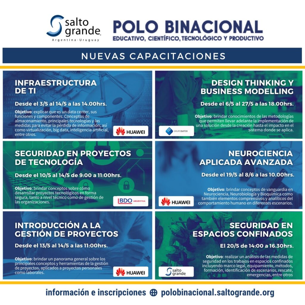 Todos los cursos son gratuitos, serán dictados de manera virtual y emiten un certificado de aprobación. La inscripción está disponible en https://polobinacional.saltogrande.org/?cat=4