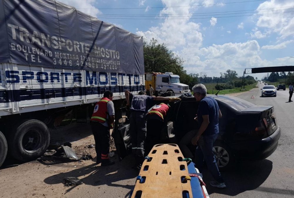 Según informan desde Bomberos, el camión con acoplado -de la empresa de transporte Mostto- se encontraba en la banquina aguardando ingresar a una arrocera que se encuentra en el lugar cuando el conductor del vehículo, que iba rumbo al Martillo, por causas que se tratan de establecer se estrelló peligrosamente entre los ejes del acoplado.