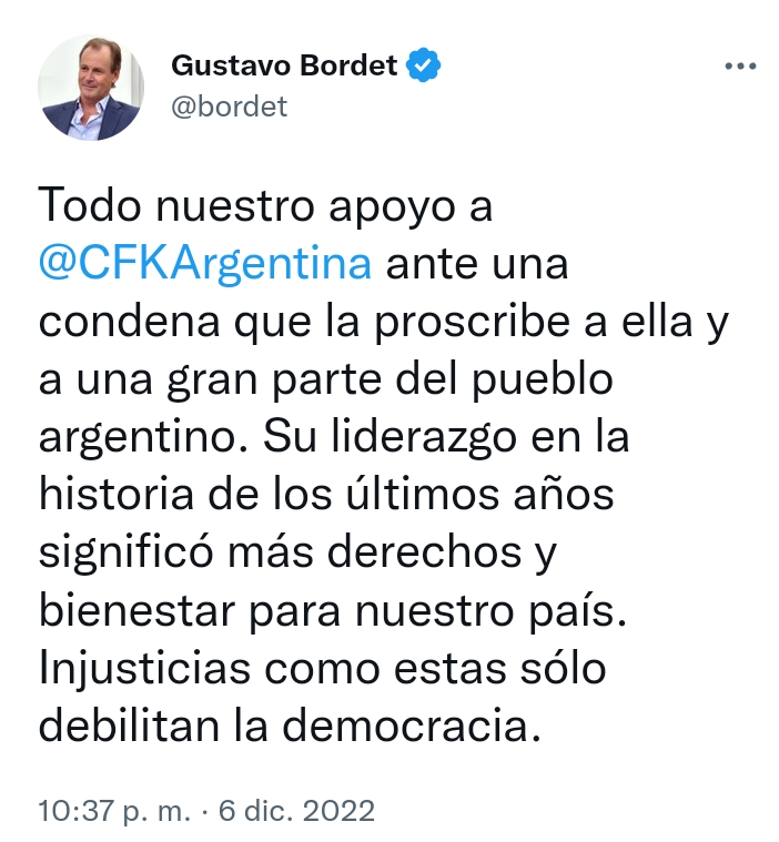 Bordet expresó “apoyo ante una condena que la proscribe a ella y a una gran parte del pueblo argentino”. Y agregó: “Su liderazgo en la historia de los últimos años significó más derechos y bienestar para nuestro país. Injusticias como estas sólo debilitan la democracia”.