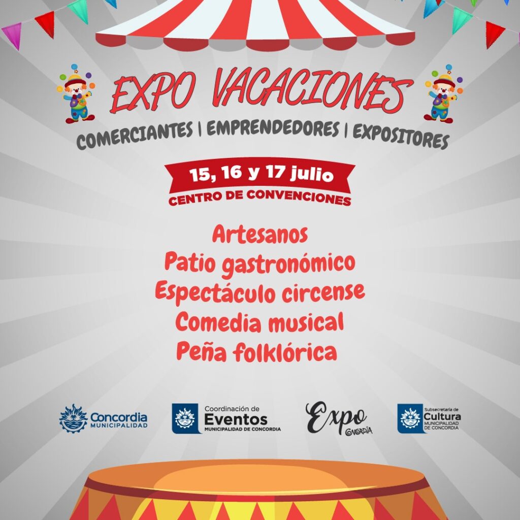 El día viernes 15 de julio, a partir de las 15 hs. se realizará en el marco de la ExpoVacaciones la Estudiantina de ECU. El sábado y domingo a partir de las 15 hs habrá espectáculos circenses con Circópatas, y el domingo 17 de julio desde las 14.30 hs Peña Folclórica con Los Hermanitos Roldán. Además, el sábado y domingo, en el Salón del Centro de Convenciones se presentará el espectáculo infantil “Pinocho”, a las 18 hs, entre otras actividades.