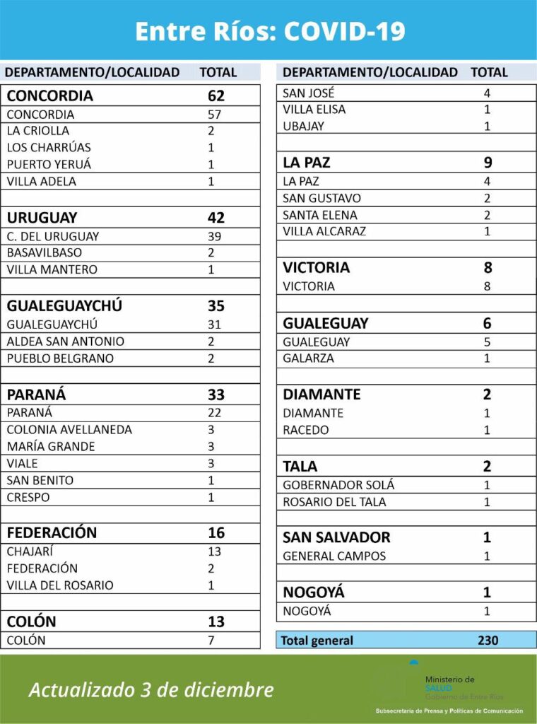 A partir de los datos reportados al 3 de Diciembre de 2020 por el área de Vigilancia Epidemiológica del Ministerio de Salud, en Entre Ríos se han sumado 230 casos de Coronavirus.