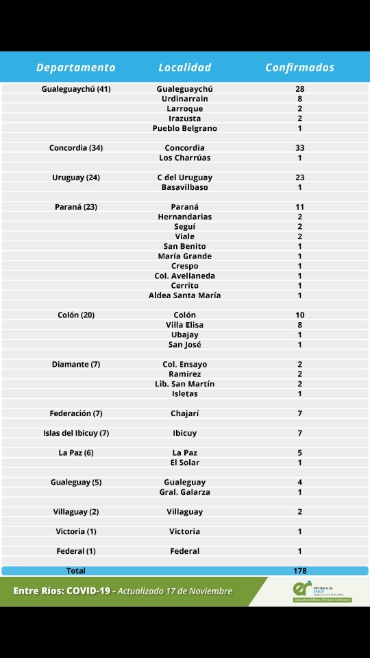 A partir de los datos reportados al 17 de Noviembre de 2020 por el área de Vigilancia Epidemiológica del Ministerio de Salud, en Entre Ríos se han sumado 178 casos de Coronavirus.