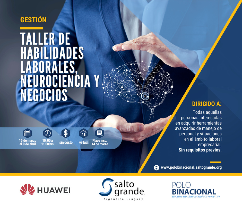 Habilidades laborales, Neurociencia y Negocios irá del 15 de marzo hasta el 9 de abril, todos los días en el horario de 10 a 11. Apunta a personas interesadas en adquirir herramientas avanzadas de manejo de personal y situaciones en el ámbito laboral empresarial. Al final del curso, se realizará una evaluación para su aprobación. El plazo de inscripción es el 14 de marzo.