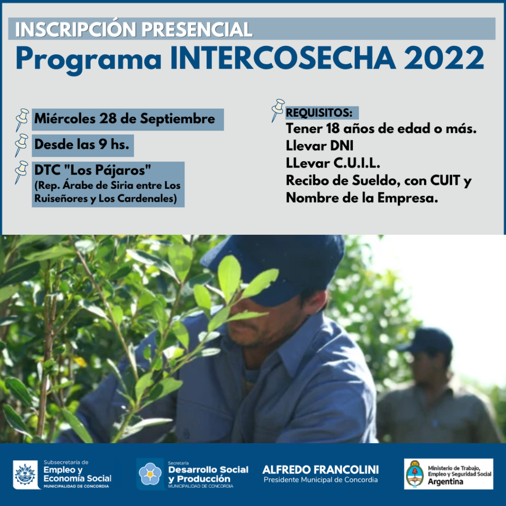 A su vez, continúa activa la inscripción online hasta el 23 de octubre, para que todas las personas en cualquier momento del día puedan realizarlo, a través del link https://acortar.link/intercosecha2022_concordia o bien ingresando a la web de la Municipalidad www.concordia.gob.ar o consultando en las redes sociales en Facebook e Instagram de la Subsecretaría de Empleo y Economía Social.