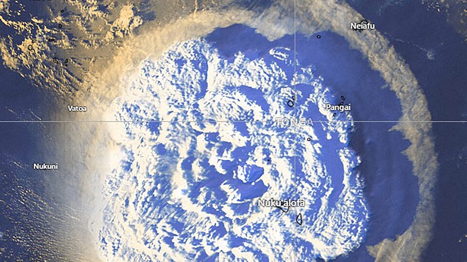 El Servicio Meteorológico de Tonga publicó en su perfil de Facebook una impactante imagen satelital de la nube causada por el volcán submarino, que ya mostró señales de creciente actividad en la víspera y que también disparo momentáneamente la alerta de tsunami.