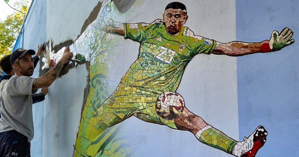 Es un muro. Y un mural, también. Porque Dibu tiene su propia obra en una de las paredes de la Ciudad de Buenos Aires: en Constitución 3340, pegadito a la autopista 25 de Mayo, hace dos semanas brilla una obra maestra del mosaiquismo. Una que conmovió al arquero de 32 años, a punto tal que el sábado Martínez reposteó en Instagram un video alegórico. Guiño de agradecimiento al trabajo que le dedicó el Grupo Artístico Boedo.
