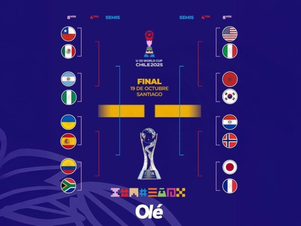 Terminada la primera fase, el Mundial Sub 20 entra en su recta final con la presencia de Argentina, que ganó sus tres partidos hasta el momento. La Selección que dirige Diego Placente se medirá en octavos de final con Nigeria y ya conoce el camino que debería afrontar para llegar a la deseada final, prevista para el sábado 18 en el estadio Nacional de Santiago.