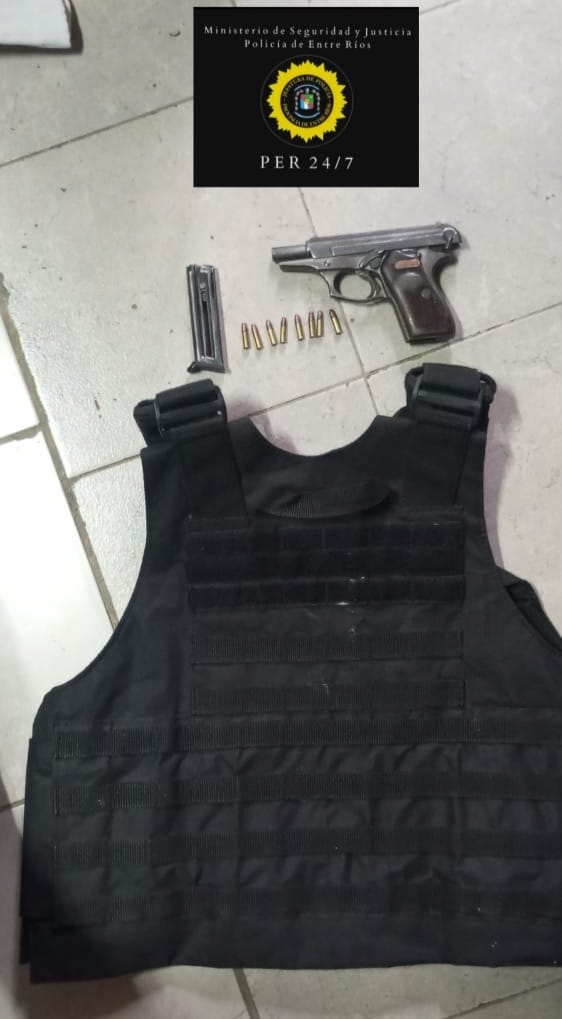 Uno en inmediaciones de calles Paula A. de Sarmiento y Pedro Duarte, donde se secuestran un chaleco policial porta placas, un arma de fuego, de puño, tipo Pistola, calibre 22 largo, con almacén cargador el que poseía (08) cartuchos completos calibre 22 largo, quedando aprehendida una mujer de 42 años de edad por tenencia ilegitima de arma de fuego.