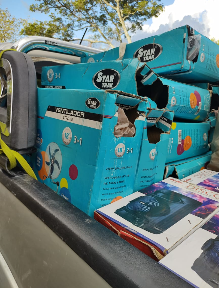 El personal visualizó en la caja de la camioneta Sillones plegables, algunos de ellos empaquetados con precintos, ventiladores de pie y de pared, todos en sus respectivas cajas y parlantes inalámbricos, también todos en cajas.