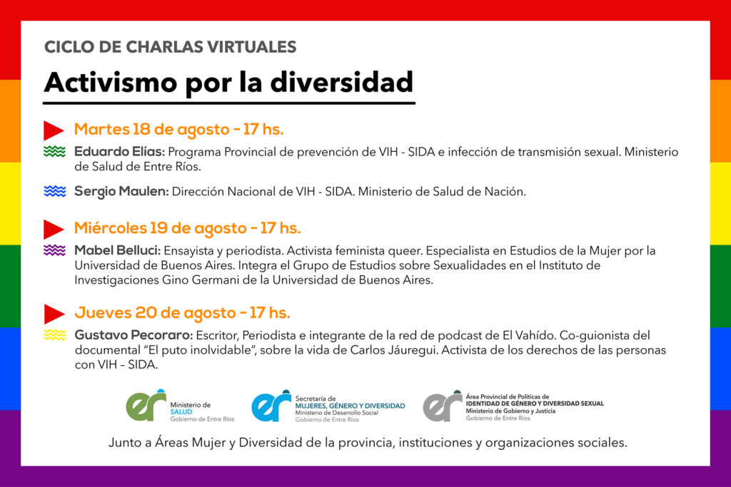 Con el objetivo de fortalecer el trabajo de las áreas Mujer y Diversidad de la provincia se llevará a cabo un ciclo de charlas en el marco del 20 de agosto, día en el que se conmemora el Activismo por la Diversidad Sexual.