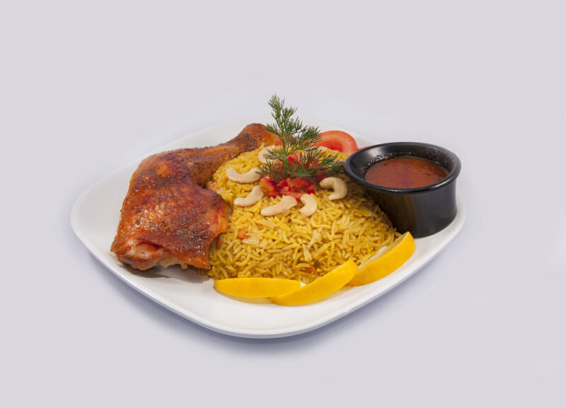 - Con todo listo se procede a preparar el plato, procurar que el arroz esté bien mezclado y disponerlo en un plato con las piezas de pollo a un costado, por arriba bañar con la salsa y decorar con frutos secos y cilantro picado.