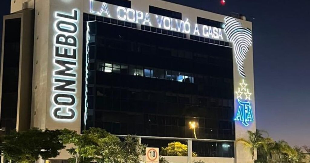 “La Copa volvió a casa”, es la frase que se logra visualizar en el frente de la sede de Conmebol en Luque, Paraguay. Sí, la entidad madre del fútbol sudamericano celebró como propia la conquista de la Selección Argentina en el Mundial de Qatar, al punto que su edificio lució con un look argentinizado: luces celestes y blancas y ¡hasta el escudo de AFA y las tres estrellas!