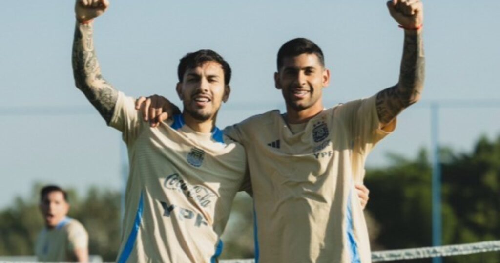 Durante el entrenamiento, el técnico contó con 18 de los 26 convocados. Los que dieron el presente en Ezeiza desde el arranque fueron Emiliano Martínez, Germán Pezzella, Nico Paz, Máximo Perrone, Facundo Medina, Juan Foyth, Walter Benítez, Santiago Castro, Benja Domínguez, Enzo Fernández, Nico Otamendi, Leandro Paredes y Cristian Romero.