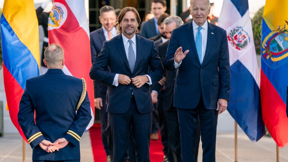 Camino a sacarse la foto grupal frente la residencia presidencial, Biden y Lacalle Pou salieron primeros de la Casa Blanca mientras que los demás líderes los seguían a cierta distancia, completando una hilera de parejas de presidentes. Una vez que todos s e alinearon frente a los fotógrafos, uno al lado del otro, con Biden y Lacalle Pou ocuparon el centro la formación. Sonrientes, intercambiaron palabras y gestos de complicidad.