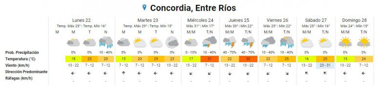 El Servicio Meteorológico Nacional -SMN- anuncia para este lunes probables lluvias aisladas en gran parte de la provincia, sobre todo a la tarde noche. Concordia no es la excepción de este final de temporada verano y comienzo del otoño que se hace notar.