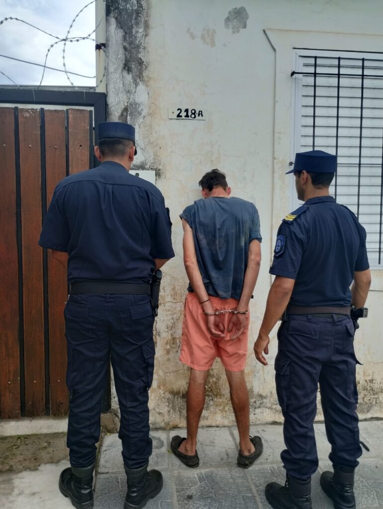 En el día de la fecha, siendo las 15:30 hs. personal del Comando Radioeléctrico en circunstancias en las que se encontraba de patrulla preventiva, llegando a la intersección de Calle Rawson y Alvear, observan a un masculino que estaba sustrayendo la cerradura de bronce de un domicilio. Seguidamente le dan la voz de alto y este sale corriendo, pero es alcanzado a pocos metros del lugar y es aprehendido. En el lugar también se procedió al secuestro de un cuchillo tipo tramontina y un picaporte de bronce. Informado el hecho circunstanciado a la Unidad Fiscal en turno, se confirmó la detención del masculino de 34 años de edad y el Secuestro y Entrega del elemento detallado al damnificado.