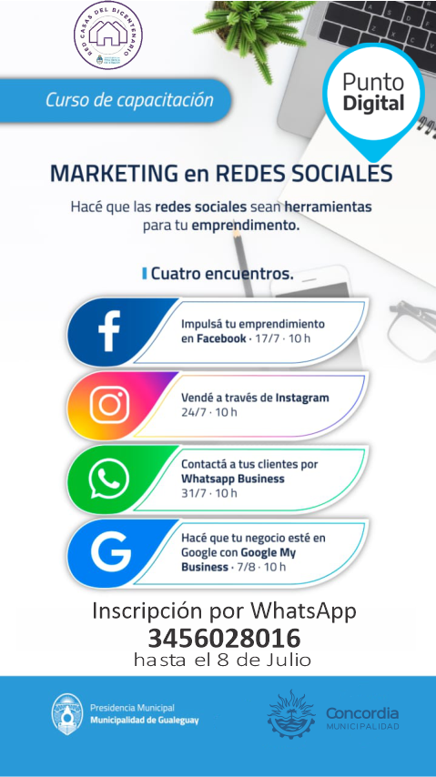 Impulsá tu emprendimiento en Facebook, Vendé a través de Instagram, Contactá a tus clientes a través de WhatsApp Business, Hacé que tu negocio esté en Google, son los tópicos de las cuatro clases que se llevarán adelante a partir del 17 de julio. “El intendente Francolini y el secretario de Coordinación de Gestión Fernando Barboza consideraron importante ofrecer esta capacitación gratuita, más aún en el actual contexto donde el uso de las redes sociales se ha potenciado debido al Distanciamiento Social, y es una vía muy importante que ayuda a muchos emprendedores y pequeños comerciantes a llegar a sus clientes”, dijo por último De León.