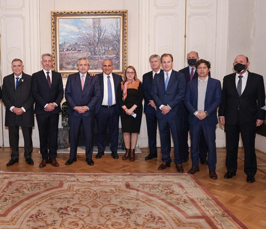 La Liga de Gobernadores se reunió primero en la sede del Consejo Federal de Inversiones (CFI), en la ciudad de Buenos Aires, y luego fueron recibidos por el presidente Alberto Fernández y el Jefe de Gabinete, Juan Manzur en el Salón Eva Perón de la Casa Rosada.