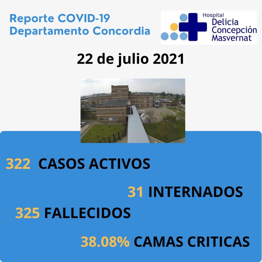 Según el reporte enviado por el área de prensa del Hospital Masvernat, hoy viernes 16 de julio, hay 322 casos activos de Covid-19, de los cuales 31 están internados, la ocupación de camas criticas Covid-19 alcanza el 38.8%. El número de fallecidos en nuestra ciudad desde el comienzo de la pandemia asciende a 325