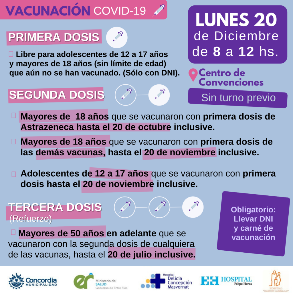 El Coes Local confirmó la realización de una masiva jornada de vacunación contra el Covid, este lunes 20 de diciembre en el Centro de Convenciones, aplicándose primera y segunda dosis, y también la tercera dosis de refuerzo, de acuerdo al cronograma de cada vacuna y de cada grupo etareo. Además adelantaron que durante toda la semana se realizarán operativos de vacunación, bajando en los grupos etáreos dependiendo de la asistencia que haya en la primera jornada del lunes.