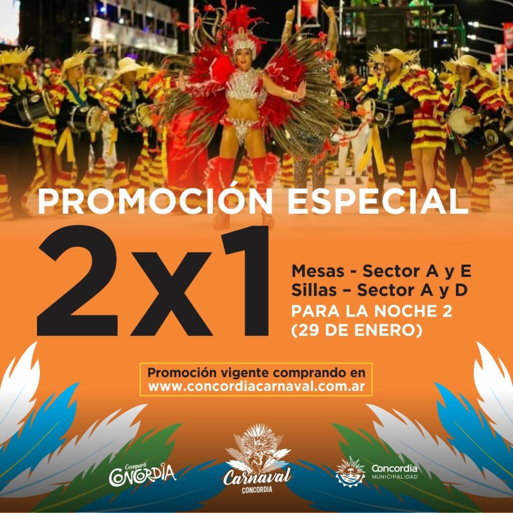 Hasta las 19:00hs de este viernes se podrán adquirir mesas del sector VIP y sillas 2X1 en sectores seleccionados para la segunda noche del Carnaval de Concordia. La promoción ya se encuentra activa y se accede desde el sitio web oficial del Carnaval.