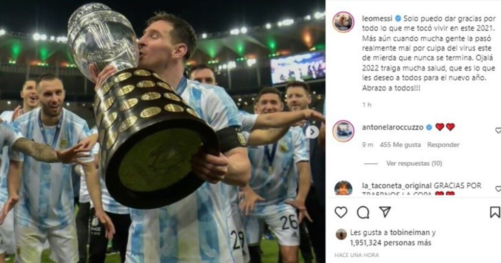 Fue un 2021 inolvidable para Lionel Messi. El Maracanazo en la Copa América fue más que un sueño postergado. Fue una descarga eterna. Una realidad que se hizo esperar. Y algo de eso quedó resumido en el mensaje que Leo compartió en la noche de este 31 de diciembre, desde su Rosario querido. El 10 saludó a sus millones de seguidores con un posteo lleno de sentimiento, de amor, de agradecimiento.